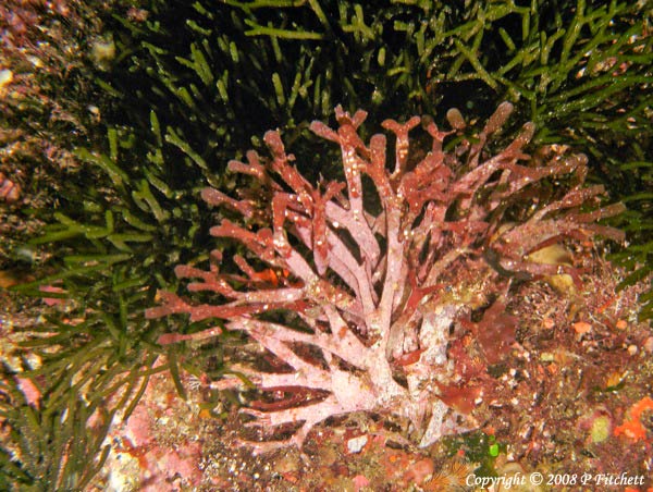 unknown red plant in front of Dead Man's Fingers (also Felty Fingers or Sea Staghorn)