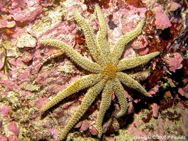 Eleven-arm starfish (with 10 arms) with Mottled triplefin