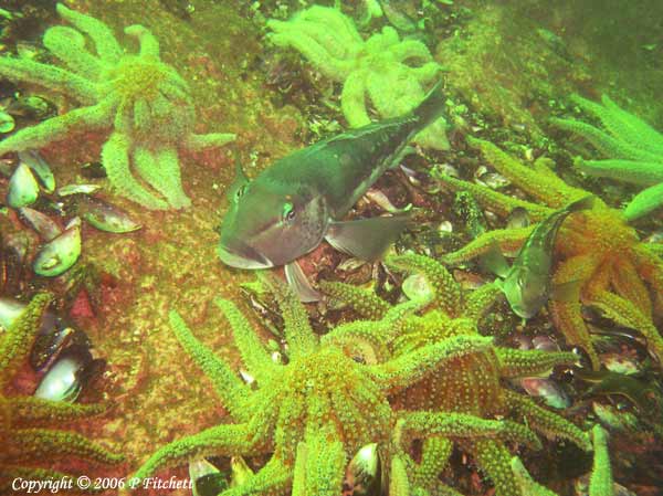 Eleven-arm sea star - a gathering, with Blue Cod